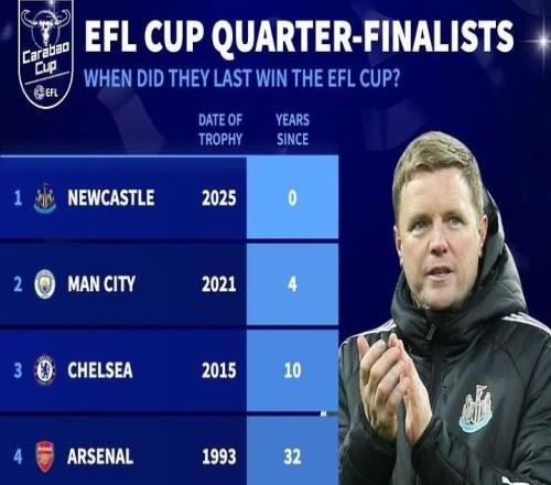 英联杯四分之一决赛将于本周打响,在此之际,德国转会市场列出了本赛季八强距离上次夺冠时间的榜单。本赛季英联杯八强距上次夺冠时间:1、纽卡 上次夺冠是2025年 距上次夺冠0年2